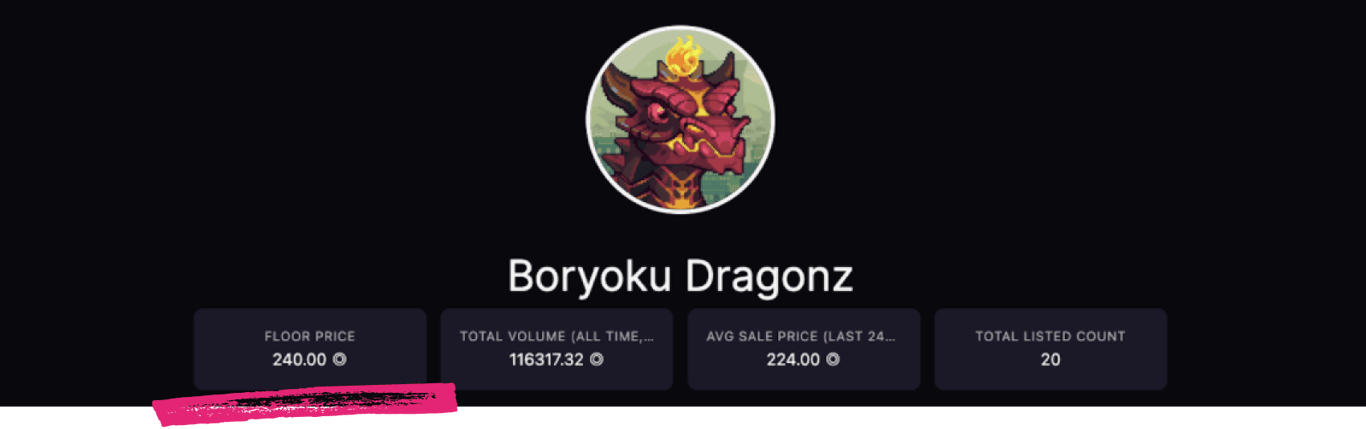 The floor price can be found on the page of every collection on Magic Eden. It is the minimum price a collection’s NFTs are being sold for! It shows how the NFT holders are valuing them. A higher floor price usually indicates a higher valuation.
