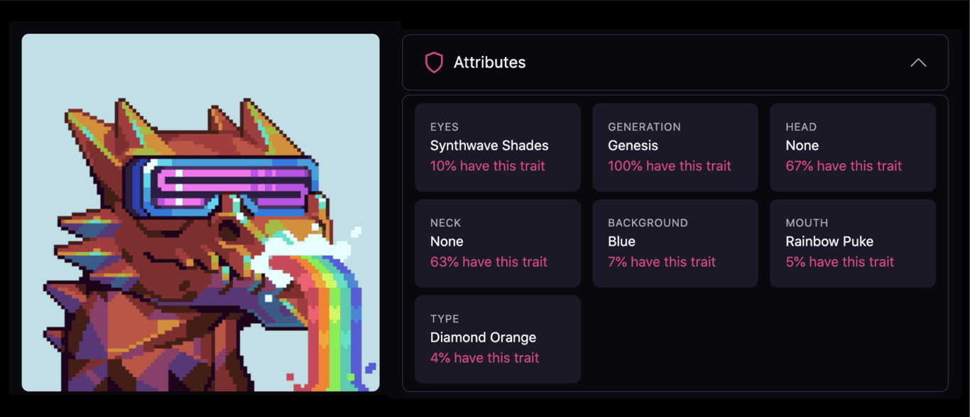 An NFT’s rarity is determined by the likelihood of its unique combination of attributes. So, if an NFT has purple sunglasses, and the purple sunglasses are only present 0.01% of the time across the collection, this can potentially make the NFT more valuable! On Magic Eden, you can see the rarity rank of an NFT on their collection page.